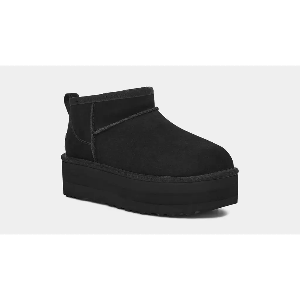 UGG’s update of its classic Mini Boot, the UGG Classic Ultra Mini Platform Boot, offers everything that the Classic Boot has, but with a lower shaft and more versatility. This line now has a practical and goes-with-anything all-black colourway. Presenting the easy-to-style UGG Classic Ultra Mini Platform Black.