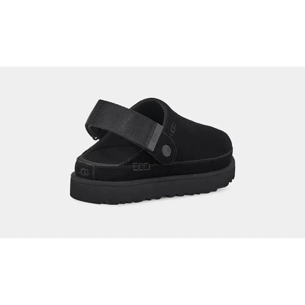 This Goldenstar Clog has an all-black velvety suede upper. The black adjustable heel strap with an UGG logo and a hook and loop closure can be styled in two ways. It can be worn as a regular heel strap or stacked on top of the vamp. The textile lining is made from 100% recycled polyester fibres while the contoured EVA footbed will keep you comfy all day long. A sustainable black foam sole unit made sustainably from sugarcane caps off the style of this clog.
