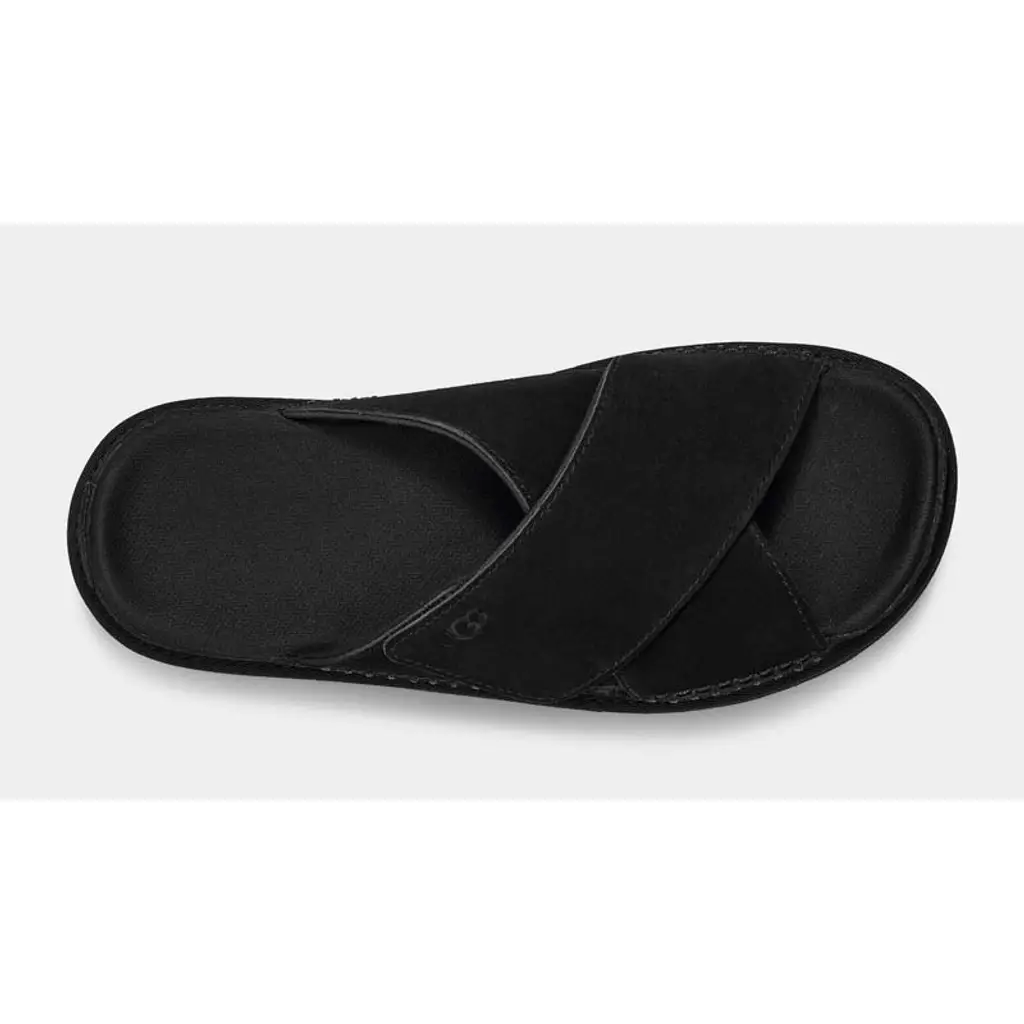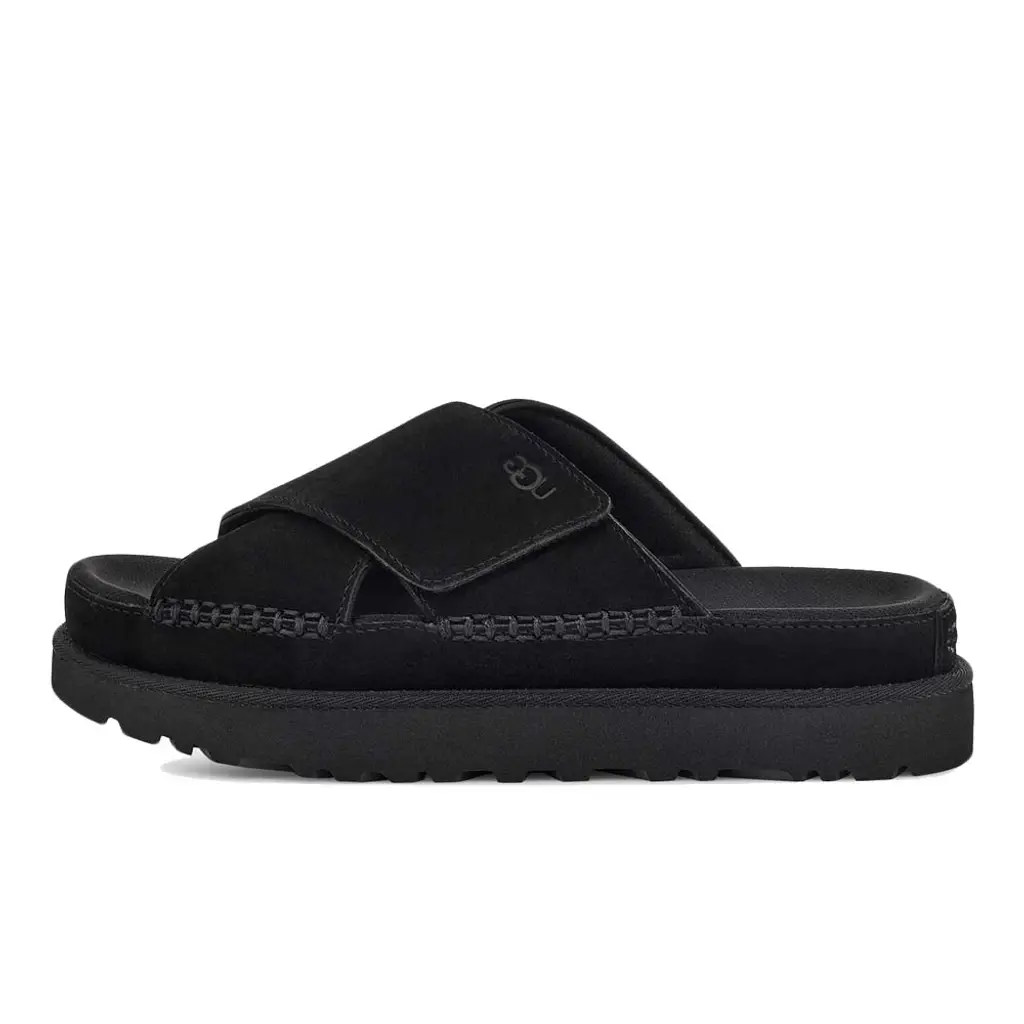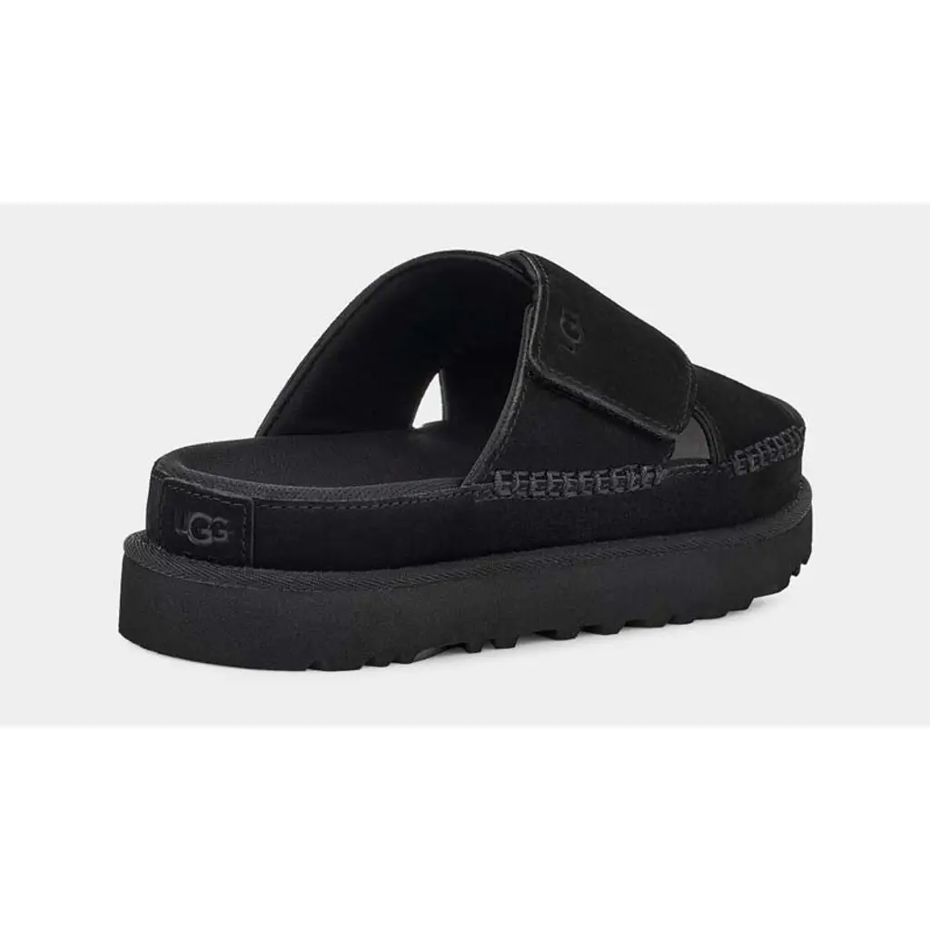 The UGG Goldenstar Cross Slide in easy-to-style black is a summer staple. This pair has supportive crossover straps made from velvety suede that’s traced with a mix of classic and blanket stitches. Branding is kept deliberately minimal and appears in form of an UGG logo that’s been hot-stamped onto one of the straps as well as the heel patch. Supporting the design is a streamlined platform in a tonal shade—it’s finished with grippy ridges underfoot for great traction by the pool and beach alike. Finally, the insole is moulded to provide comfort.