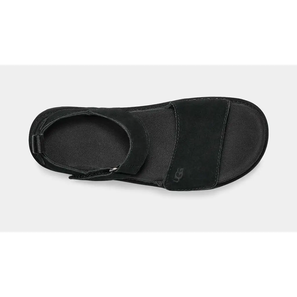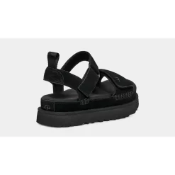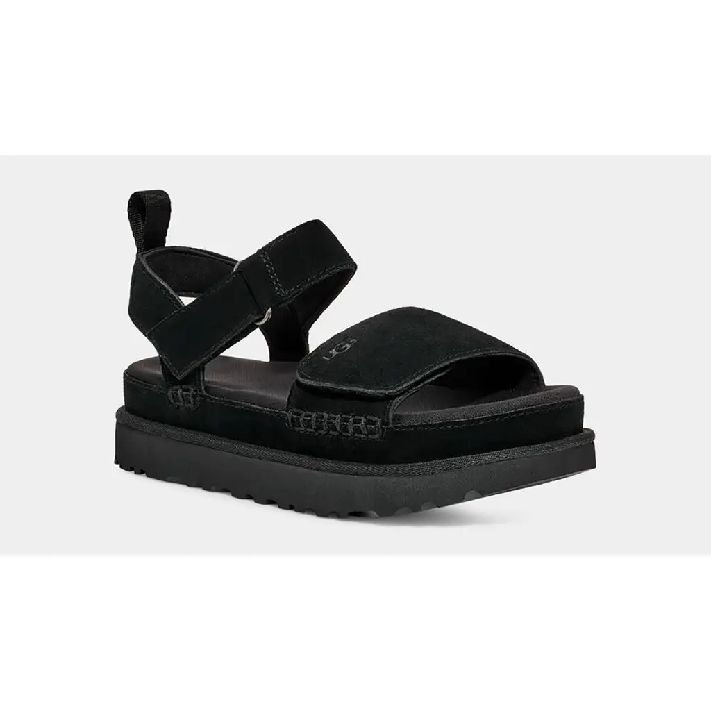 The UGG Goldenstar Black is a minimalist riff on the hiking sandal. This pair is covered in velvety black suede meticulously finished with tonal topstitching. Mesh lands on the insole for comfortable wear, while the streamlined flatform midsole is traced with deep ridges for grippy traction. The double Velcro straps—a metal-hinged one at the ankle, the other one on the vamp—provide a personalised fit, with the heel tab serves as anchor during on-off wear. Branding is very subtle and shows in the UGG lettering on one corner of the front strap.