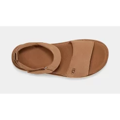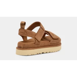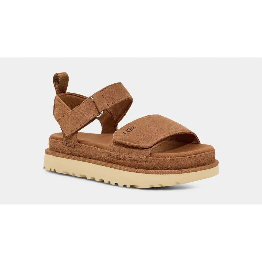 The UGG Goldenstar Chestnut is a hiking-inspired sandal. The upper is wrapped in premium chestnut-hued suede stitched together with tonal threads. It’s set on a flatform midsole for comfortable lift. Velcro straps on the ankle and vamp allow for a snug, personalised fit and are complemented with a heel tab ensuring easy on-off wear. Branding comes in form of UGG lettering on the front strap as well as the heel. Meanwhile, the clean-lined midsole introduces a soft beige and is furrowed with ridges underfoot for grippy traction in city and outdoor trails alike.