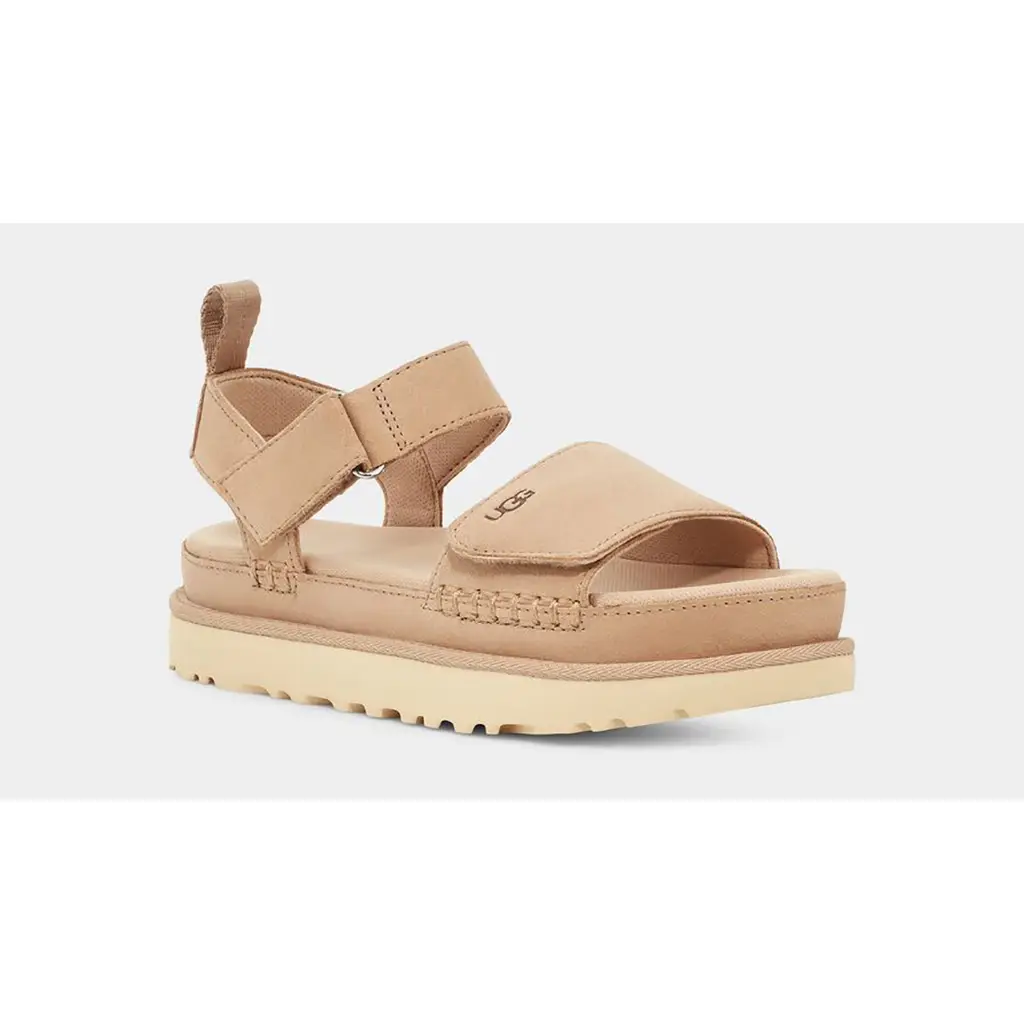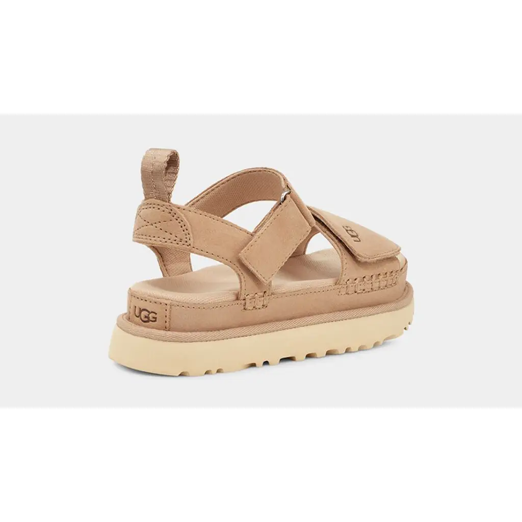 The UGG Goldenstar Driftwood sandals are a wear-with-anything option for summer. The upper is wrapped in smooth beige suede with chunky stitching along the front and medial side. Brown UGG lettering comes in via the front strap and heel for subtle branding cues. Meanwhile, the two Velcro straps enable you to personalise the fit. They’re backed with breathable mesh, too, just like the insole, and ensure added ventilation during hot days. Finally, the tonal pull tab on the heel allows for easy on-off wear, while the streamlined midsole introduces a lighter beige hue and is finished with grippy ridges underfoot.