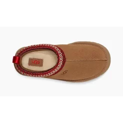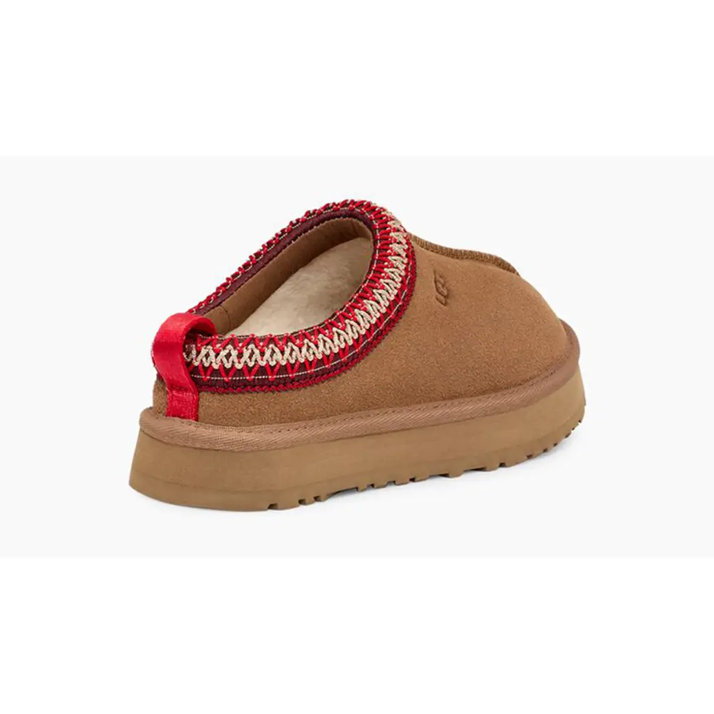 The UGG Tazz Slippers GS Chestnut slippers are a must-have for lazy weekends. They’re crafted from premium camel-brown suede with exposed topstitching through the raised pipe tracing the centre line. The opening is embellished with contrasting red and beige zigzag stitches which pop forth from a dark-brown backdrop. A signature hotstamped UGG logo lands on the upper side—the combination of suede upper and rubber midsole is no less of a label signature, though. The inside is lined for the ultimate comfort feeling, while the ridged pattern underfoot provides traction outside of your living room.