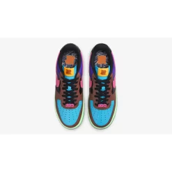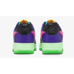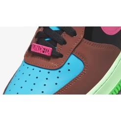 This AF1 swaps out its usual smooth leather panels with glossy patent leather from heel to toe except for the Swooshes. The toe box is light blue while the toe box, mudguard and eye stay panel are chocolate brown. The mid-panels are pitch black and the heel panels are eye-catching purple. The signature profile Swooshes on both the medial and lateral mid-panels are a sem-translucent TPU in vibrant pink. Undefeated branding can be found on the pink metal lace deubrés while its 5-Strike logo embellishes the tongue tabs and is stamped on the lateral heel panel. On the other hand, Nike Air branding is embossed on the black heel tabs. A mint green midsole and a leaf green rubber outsole cap off the style of these kicks.