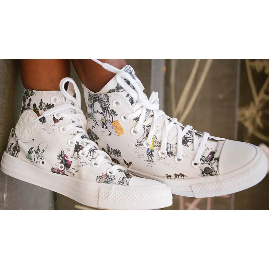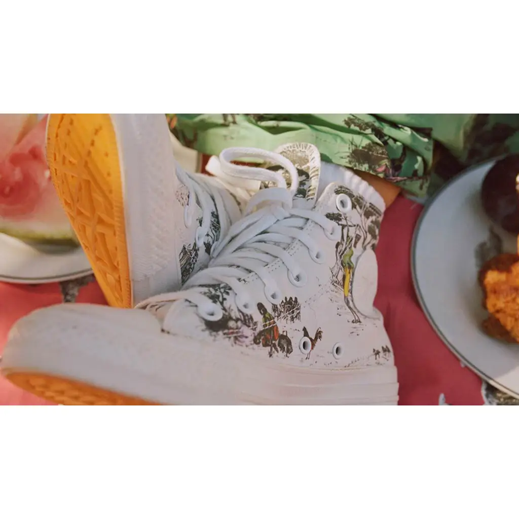Crafted from Converse’s signature durable canvas fabric, the uppers are decked out in a classic white and display intricate artwork graphics for a one-of-a-kind look. Other notable details include a yellow Union brand tag and white-tone metal lace loops to help keep the pair firmly on feet.