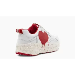 They come painted in a valentine’s day themed colourway that decorates the clean white base layer with splashes of red, even featuring a heart-shaped graphic located on the side of each shoe. The uppers are crafted from mid-weight premium leather for a solid feel, lined with red mesh to ensure optimum comfort and moisture wicking over extended periods of wear.