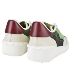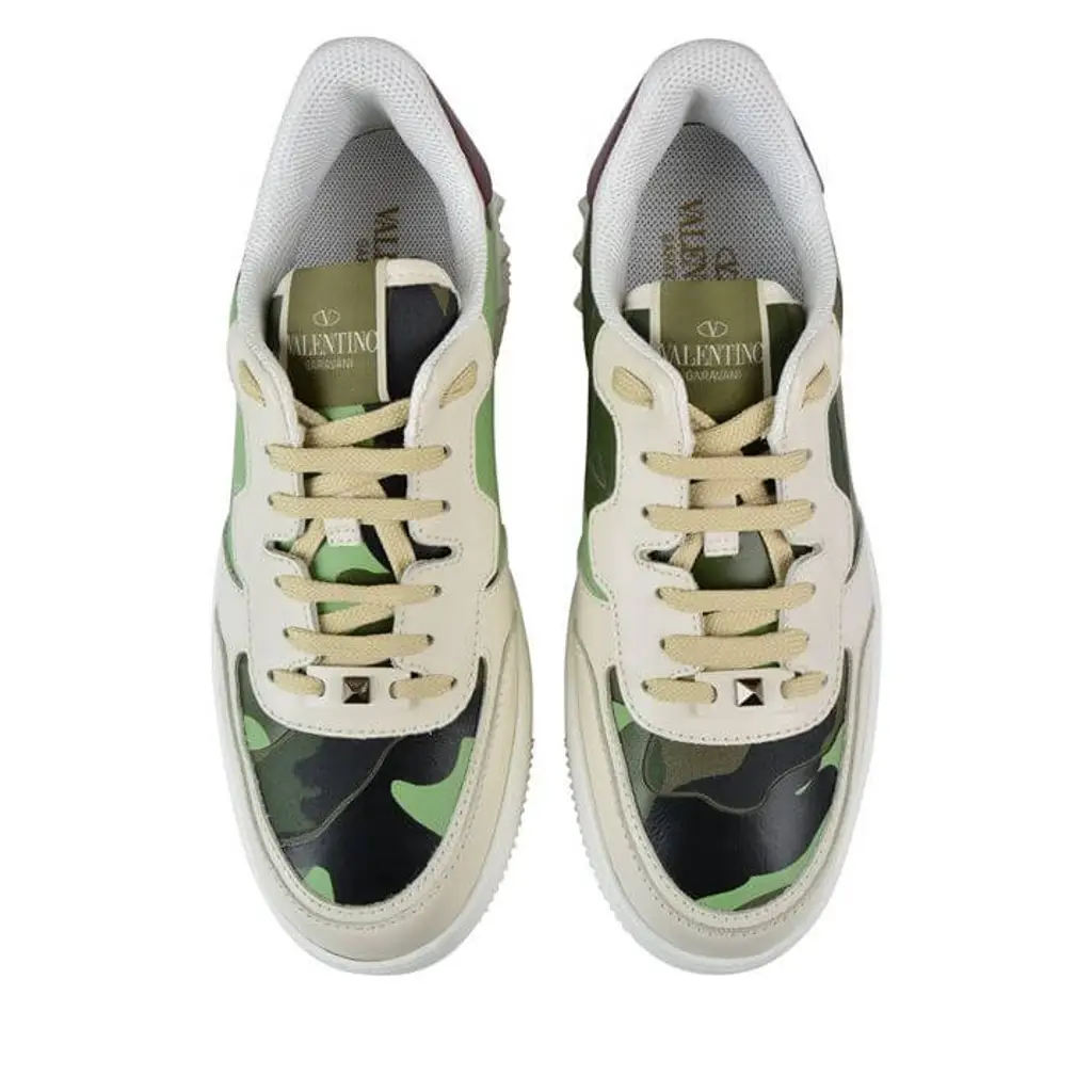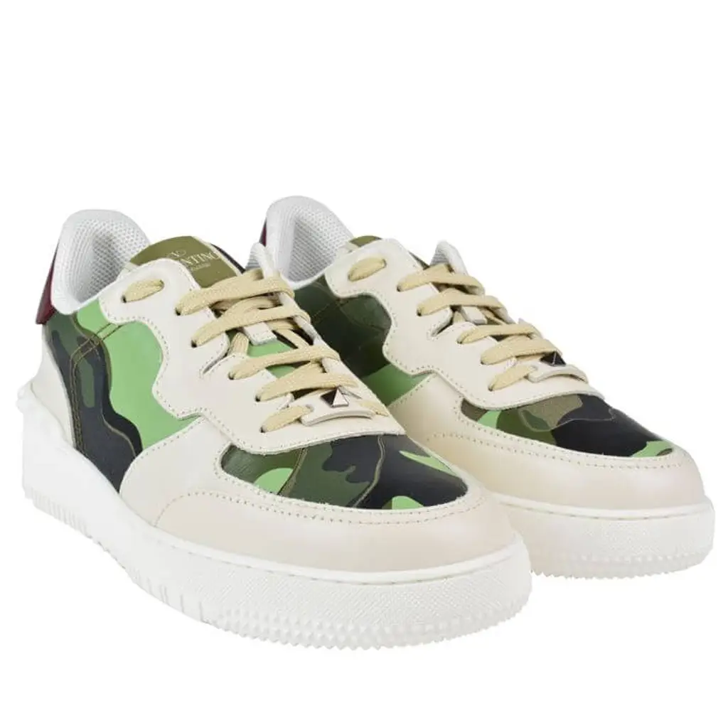 This edition of the Valentino trainer is dressed in a mix of white and different green shades. These shoes are made in Italy and feature an eye catching Camo print on the white upper. The camo print is done in different green shade. The pair also includes contrasting leather panels and arrives with a lace up closure. There is the iconic rock stud embellishment with a set of off white laces. Hits of burgundy is visible on the back heel while the overall design is completed with a chunky white sole unit.