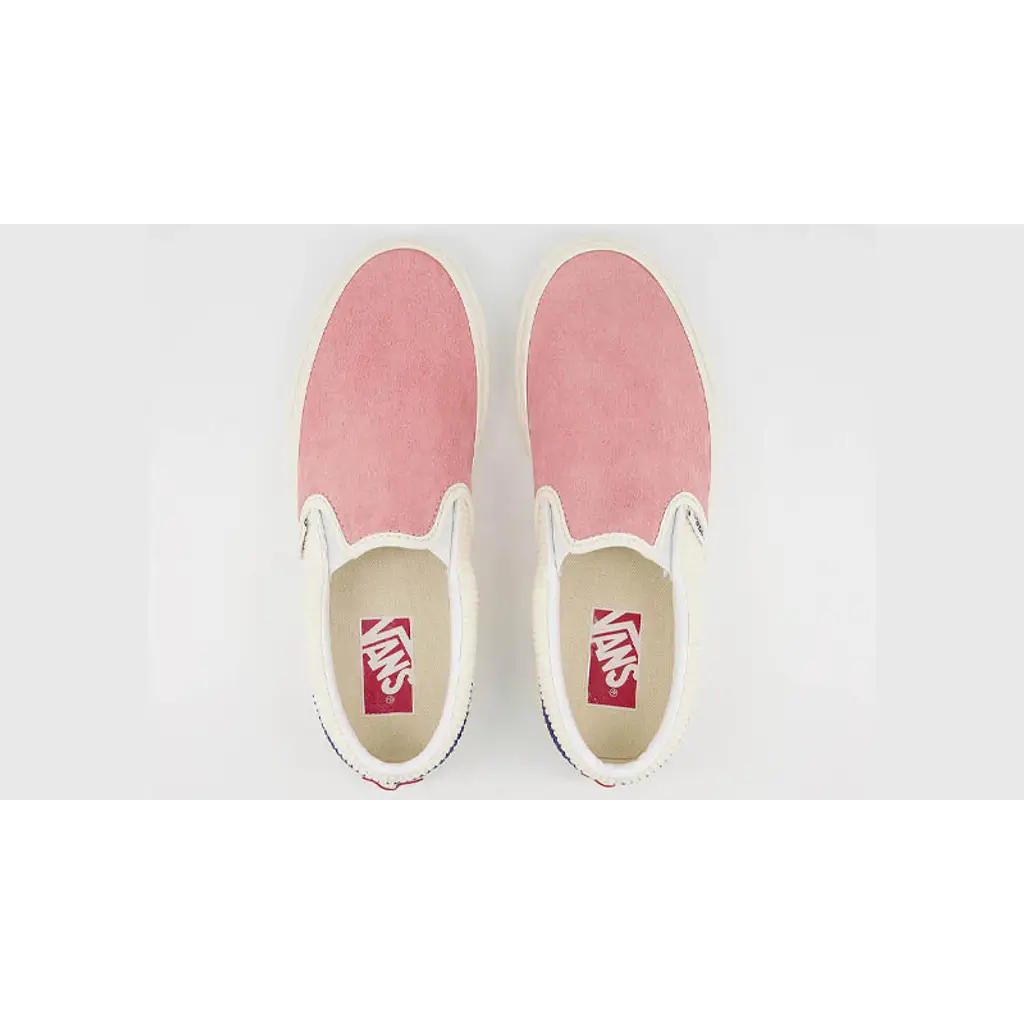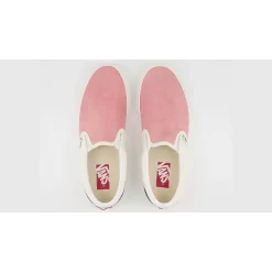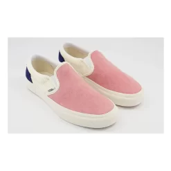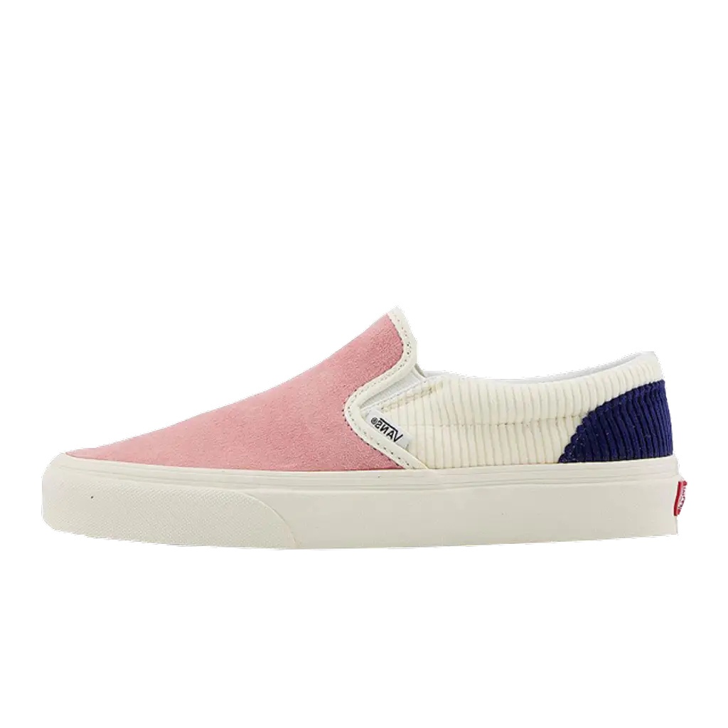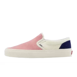 Step into summer with this cord pink and cream Vans Slip-On with a soft suede upper on the toe box leading up to the tongue that’s contrasted with cream and navy blue corduroy around the heel and collar.