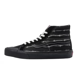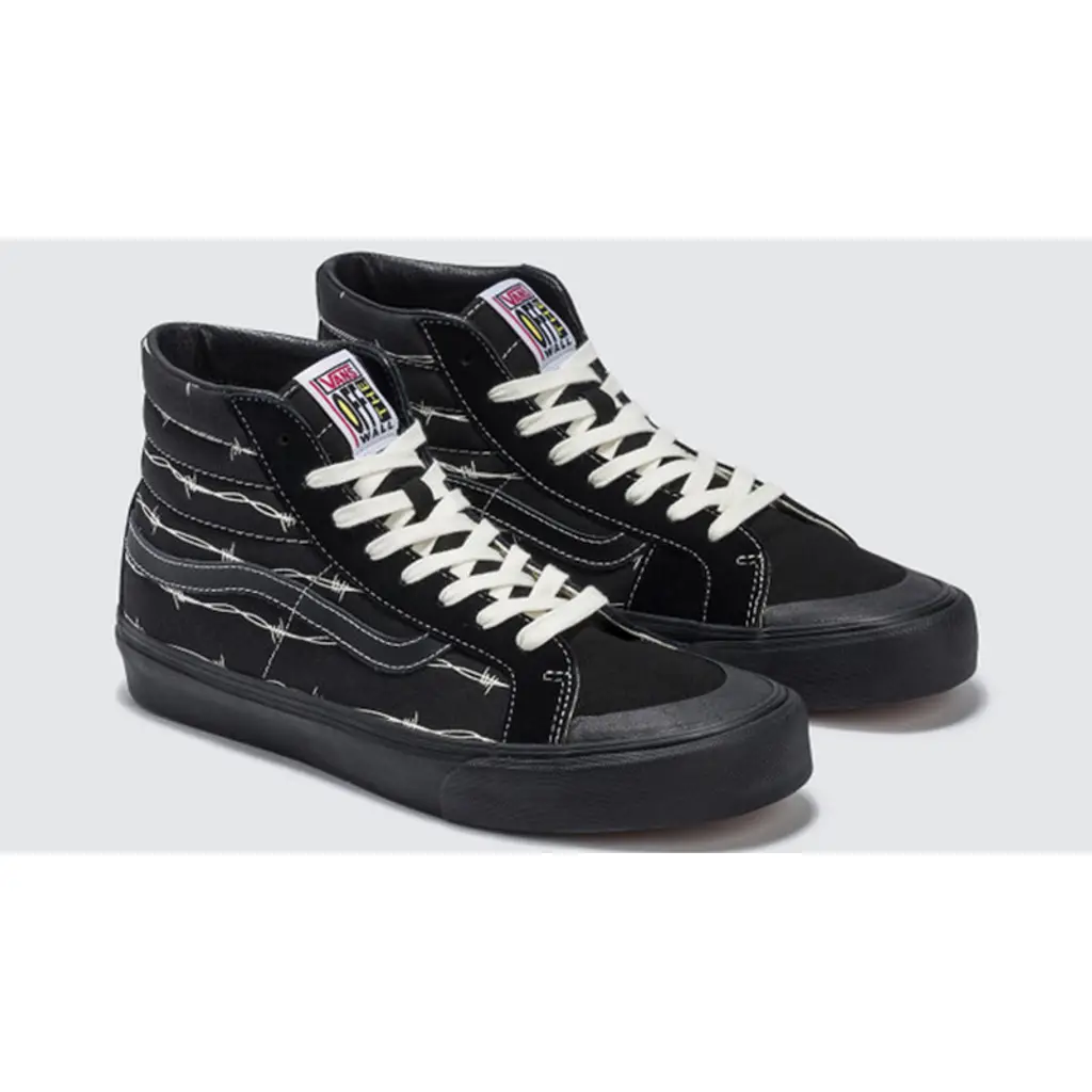 Utilising an all black aesthetic for this release, the Vans Sk8-Hi 138 SF Black is painted in a murdered out hue, with a blacked out jazz stripe running down the side panels. Crafted from a combination of materials including premium suede and versatile canvas, white lacing offers a dash of contrast, and to round it all off, a barbed wire motif hits the lateral and medial sides for an almost punk rock look.