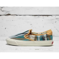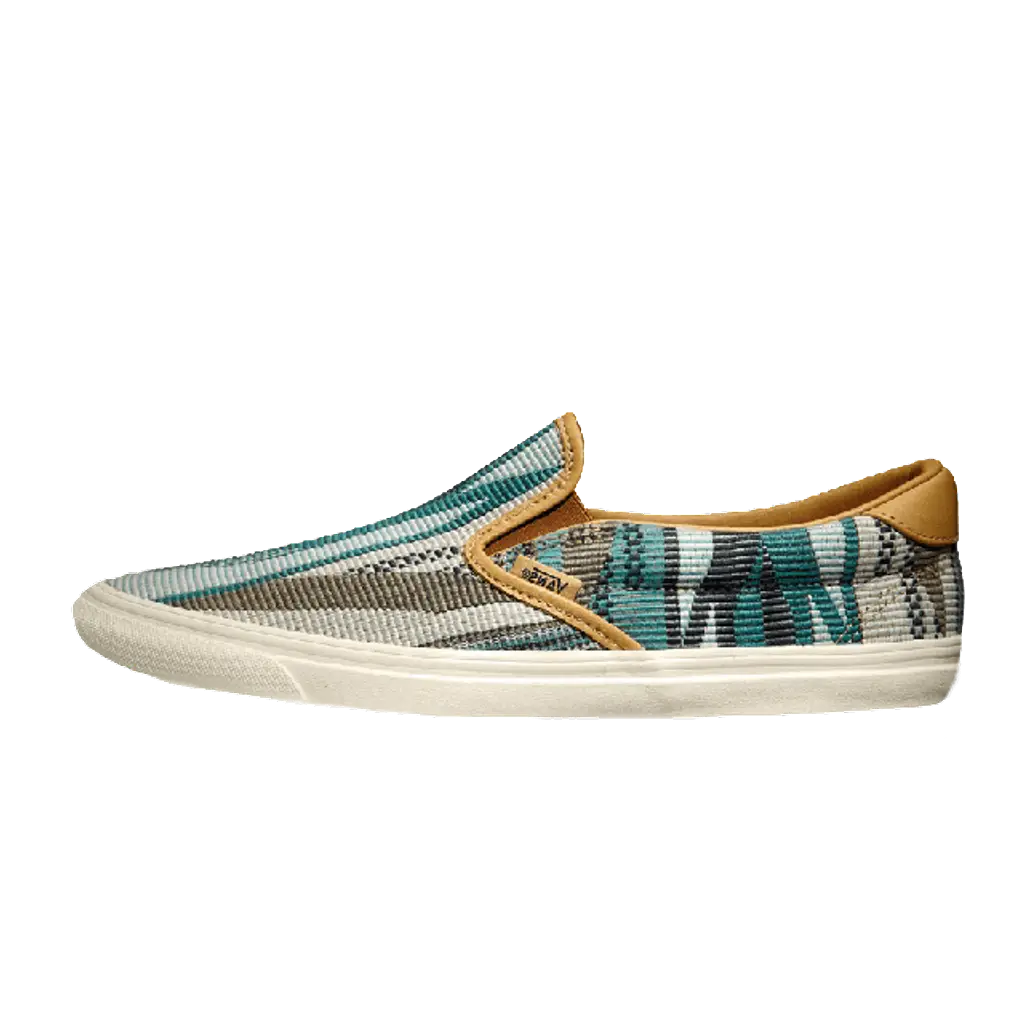 This Slip On 59 is an iconic model from Vans collection, a thinned down form of a one of the most notable skate shoe ever. This premium new model is designed by Vans Vault associate Taka Hayashi. For this pair, he used a special woven material upper, motivated by the patterns used by New Mexico natives. The shoe is finished off with smooth leather trim.