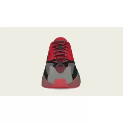 The uppers are crafted from various different fabrics and showcase hits of red, black, grey, teal and orange. Discreet three-stripe branding is featured on the lateral sides, while the rest of the kicks are totally absent of branding – in typical Yeezy fashion.