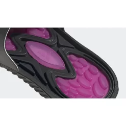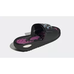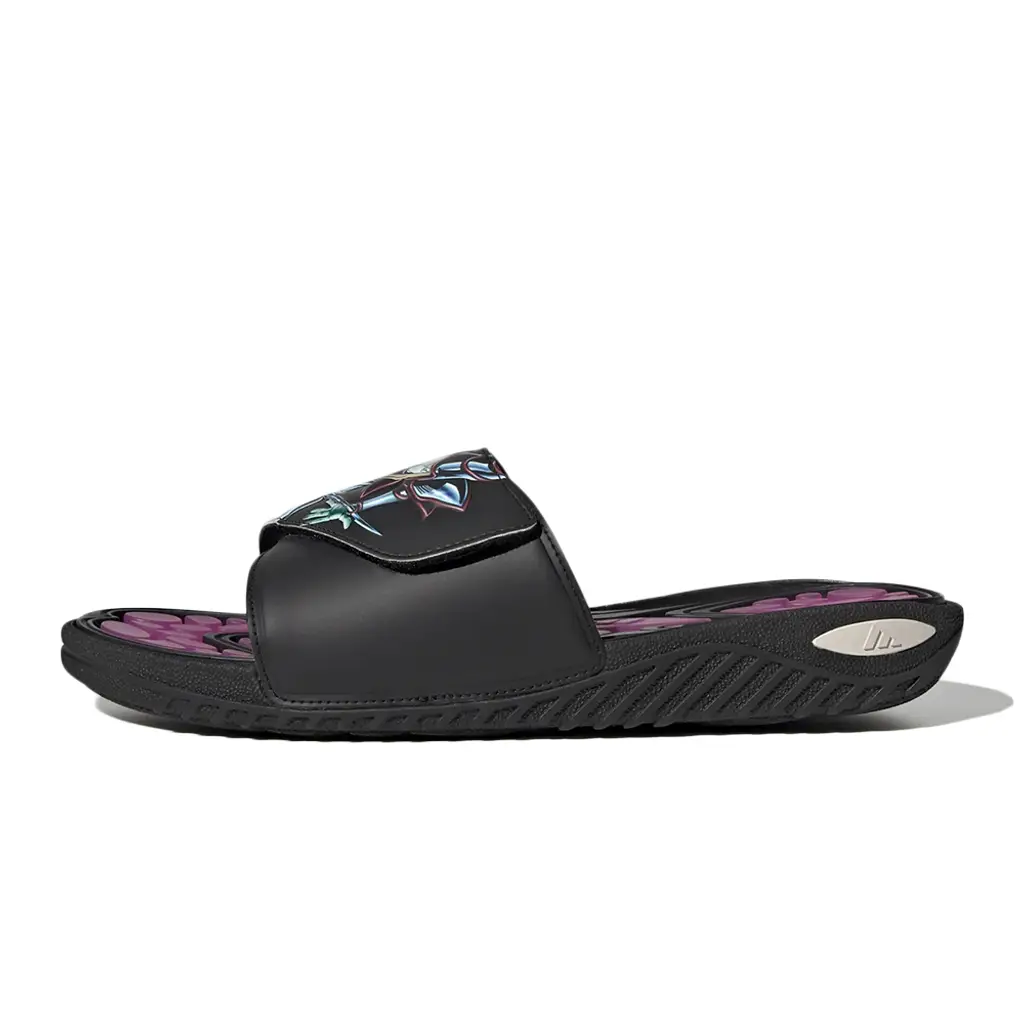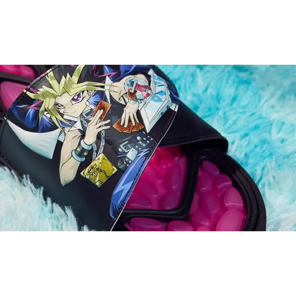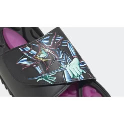 This Reptossage slide has a mostly-black upper with a hook-and-strap closure. The left slip-on shows off the golden-haired protagonist, Yugi Mutou, while the left one features his monster of choice, the purple-clad Dark Magician. The PVC footbed features the Dark Magician’s colour of purple. The EVA outsole is black, matching the rest of the footwear’s colour. adidas Three Stripes in white stand out on the lateral heels. A special commemorative gold hang tag caps off the look of this Reptossage.